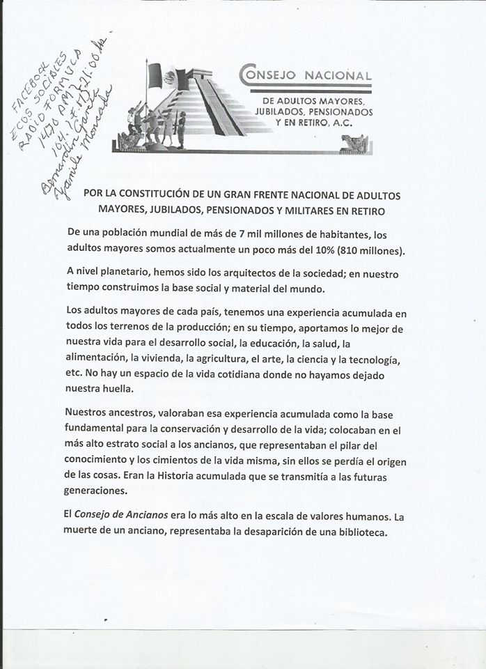 El Consejo Nacional de adultos Mayores, Jubilados, Pencionados y Militares en Retiro convocan a todos las organizaciones de Adultos Mayores de México y del mundo para construir una red de contactos y trabajar juntos construyendo el Consejo de Ancianos del Siglo XXI