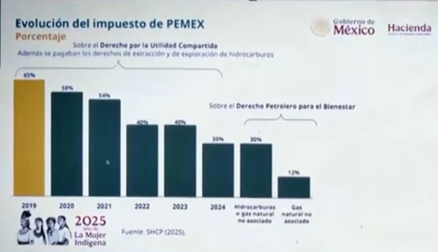 Modular la carga fiscal en la que antes de la 4T, Pemex pagaba el 65%, y ahora con el derecho petrolero para el Bienestar se contempla 30% en hidrocarburos y 12% en gas natural.